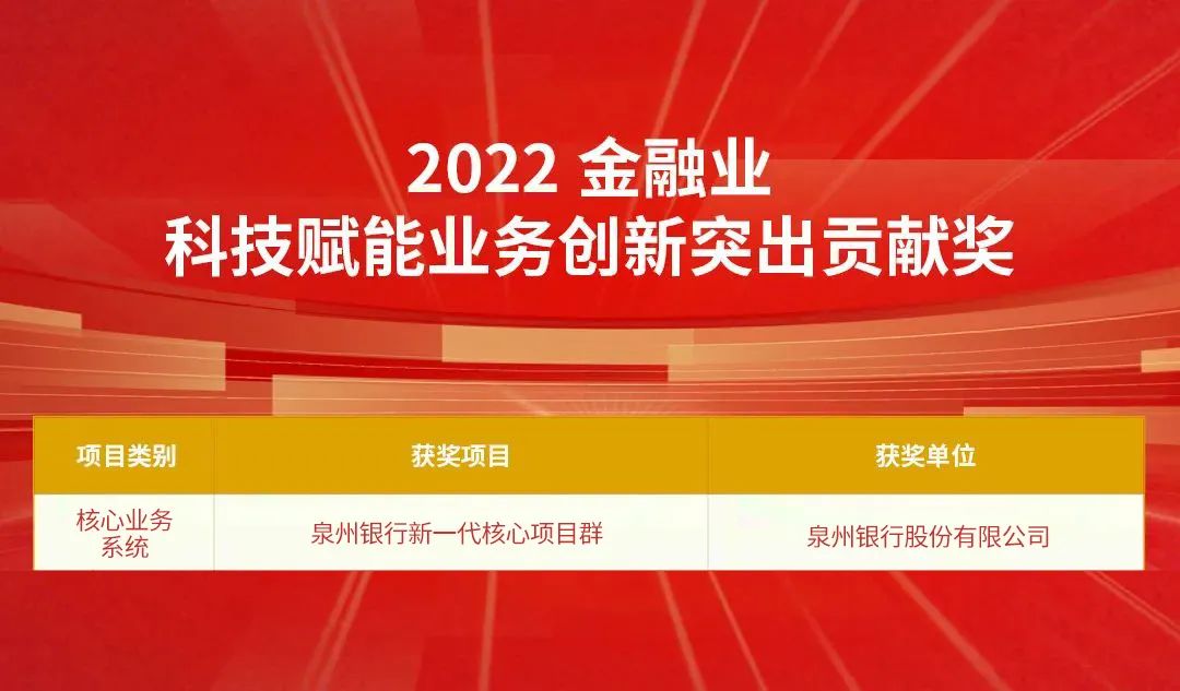 由BB贝博艾弗森官网参与建设的“秦皇岛银行新一代分布式核心系统建设项目”和“泉州银行新一代核心项目群”分别获评“2022金融业数字化转型突出贡献奖”和“2022金融业科技赋能业务创新突出贡献奖”。