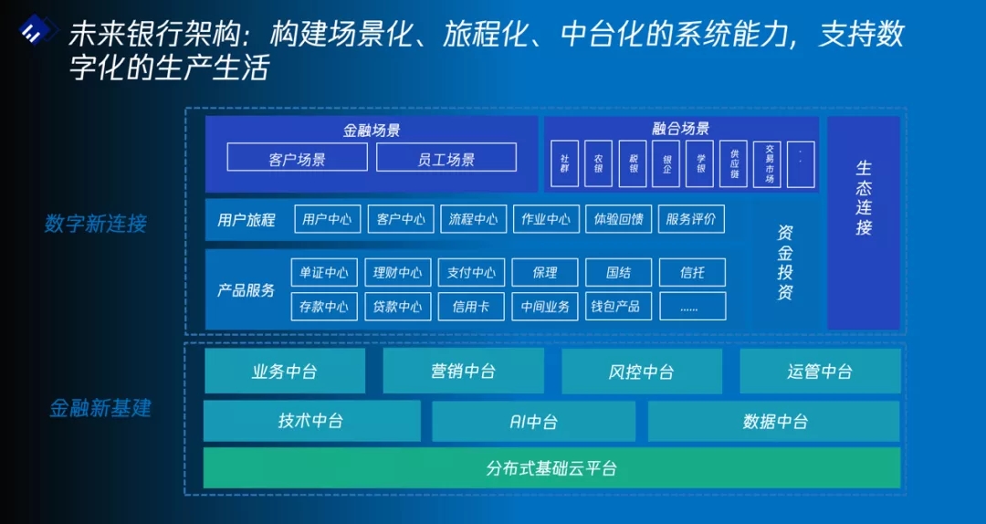 在银行数字化转型的能力支撑上,联合方案以BB贝博艾弗森官网未来银行架构ModelB@nk5.0为指引,来建设新基建和新连接两大层次的能力体系。通过金融新基建的三层体系,提供IT基础设施的分布式基础云平台层;提供数字化、智能化、分布式能力的数据中台、AI中台和技术中台层;提供金融基础支撑能力的业务中台、营销中台、风控中台和运管中台层,三个层次各个中台之间互相赋能,为上层的新连接能力奠定坚实基础。在数字新连接层,从场景端出发,通过差异化的产品服务、旅程式的用户服务来构建金融场景及融合场景,为用户提供智能化、数字化、旅程式的“场景+金融”的一体化服务。